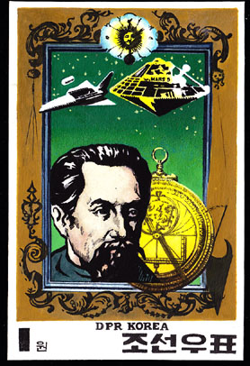 Скажу больше: это фальшивки ещё и потому, что на тиражной марке КНДР не рисунок, а фотоколлаж. К тому же по незнанию на фальшивках в некоторых местах нанесён растр, который получается только после цветоделения и растрирования. Это особенно хорошо видно на шаттле в верхнем левом углу.