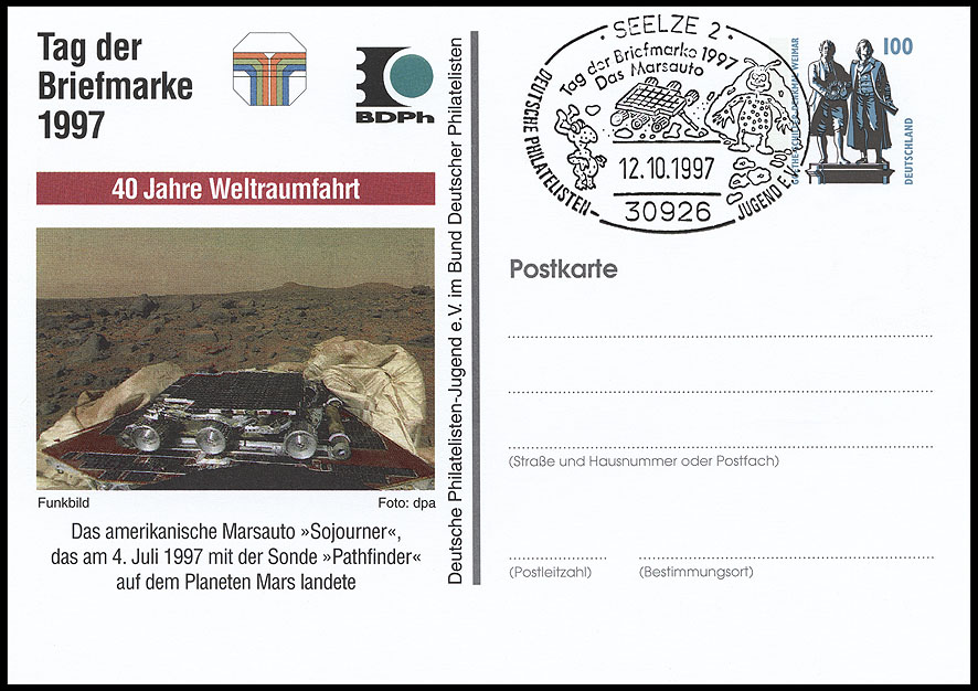 Про Луну нужно вспоминать, а с Марсом, да, было такое. До сих пор бытует безумная теория, что разумные марсиане живы, но прячутся от людей, сознательно не попадая в поле зрения марсоходов. Даже спецштемпель был с таким рисунком, на котором марсианин прячется за скалой от американского марсохода "Патфайндер" - Германия, Зельце, 12 октября 1997 года: